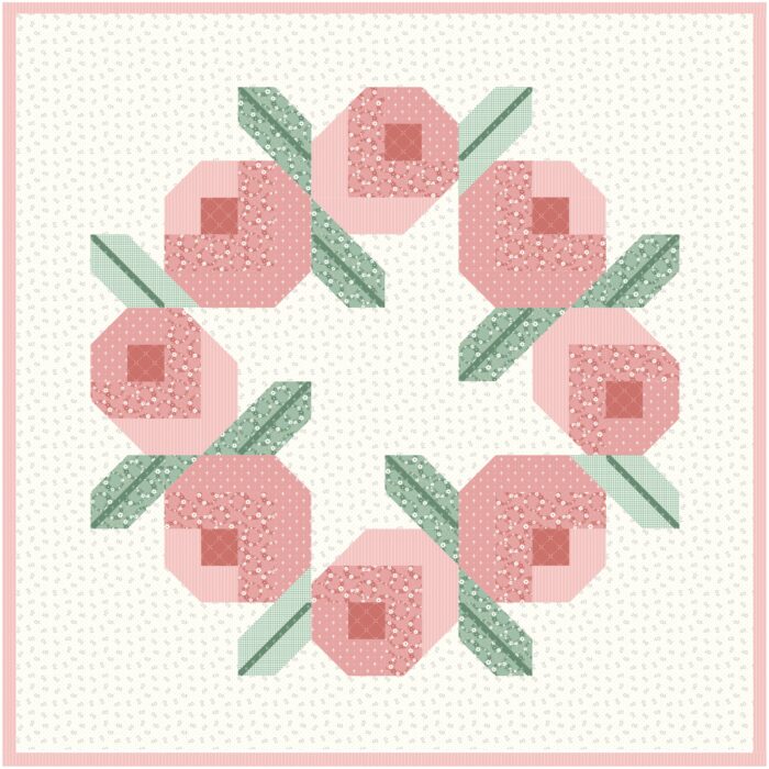 I'm excited to introduce my latest new quilt pattern, Briarcreek Blooms! This rose wreath design is a little bit outside the box for me. I wanted to design a sweet, feminine pattern to go with my Mary Catherine fabric collection that will be arriving in stores in September. This collection is a bit of a love letter to mid-century girlhood and I wanted to design a quilt that would capture that heirloom, girl-y vibe. The result is this prim but playful rosebud wreath surrounded by bows and picot points for a soft ode to girlhood.