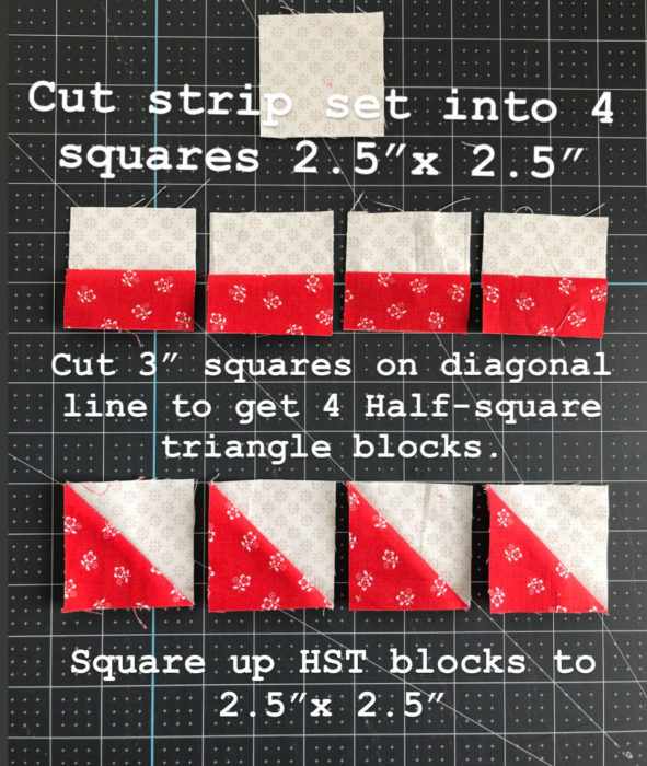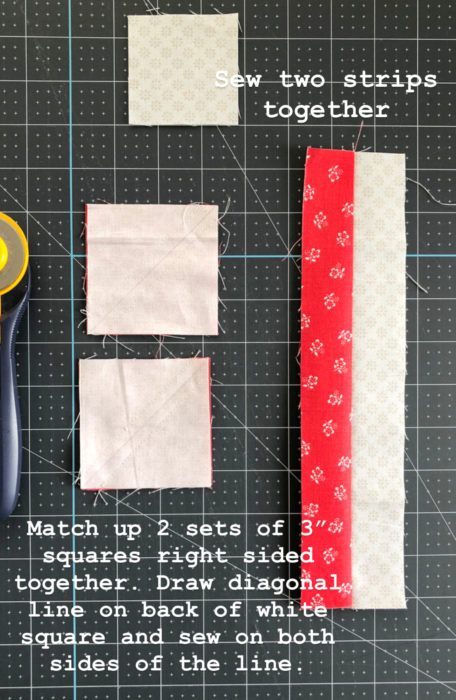 Match up 2 sets of 3" x 3" squares (a red and a white square) right sides together. Draw a diagonal line on the back of the white (background) square and sew two ¼" seams on both sides of diagonal line. Then cut squares in half on the diagonal line to create 4 Half Square Triangle (HST) blocks.