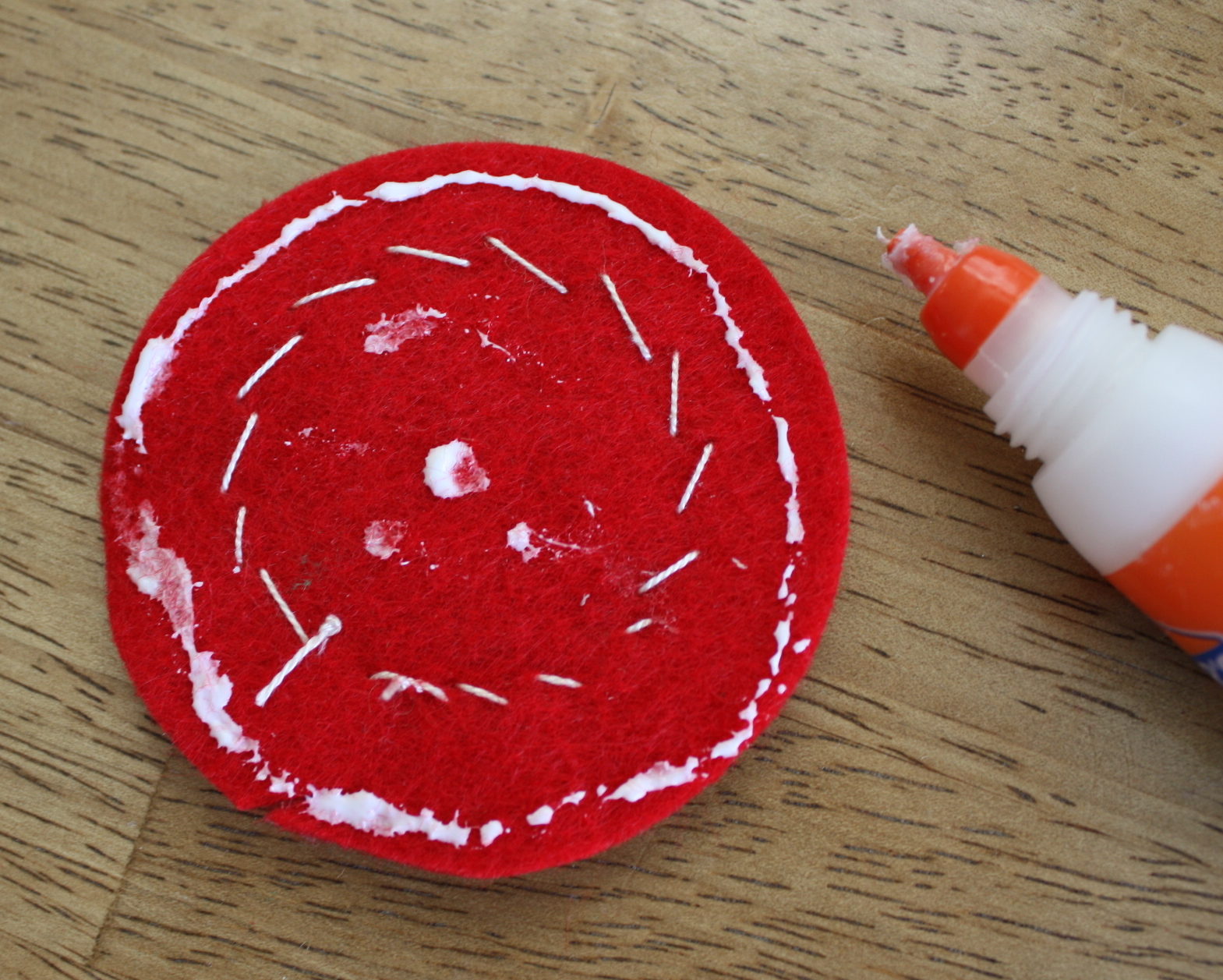 Now pull out that Elmer's glue. I loved the way the Elmer's worked. Wasn't too heavy or messy (or hot), plus it's washable. Glue sticks won't work. (I tried it.) Apply a very small line around all the edges of the circle and a dab in the middle. YOU DON'T NEED MUCH! If you put too much on it could get bumpy and dry clumpy. A very little bit works great and won't show up like bumpy patches under the felt. The heavy canvas helps provide great stability. I was amazed how well these circles stuck. At first I was just going to use the glue to hold things down temporarily and then sew them in place, but they stuck so well, I didn't need to sew!