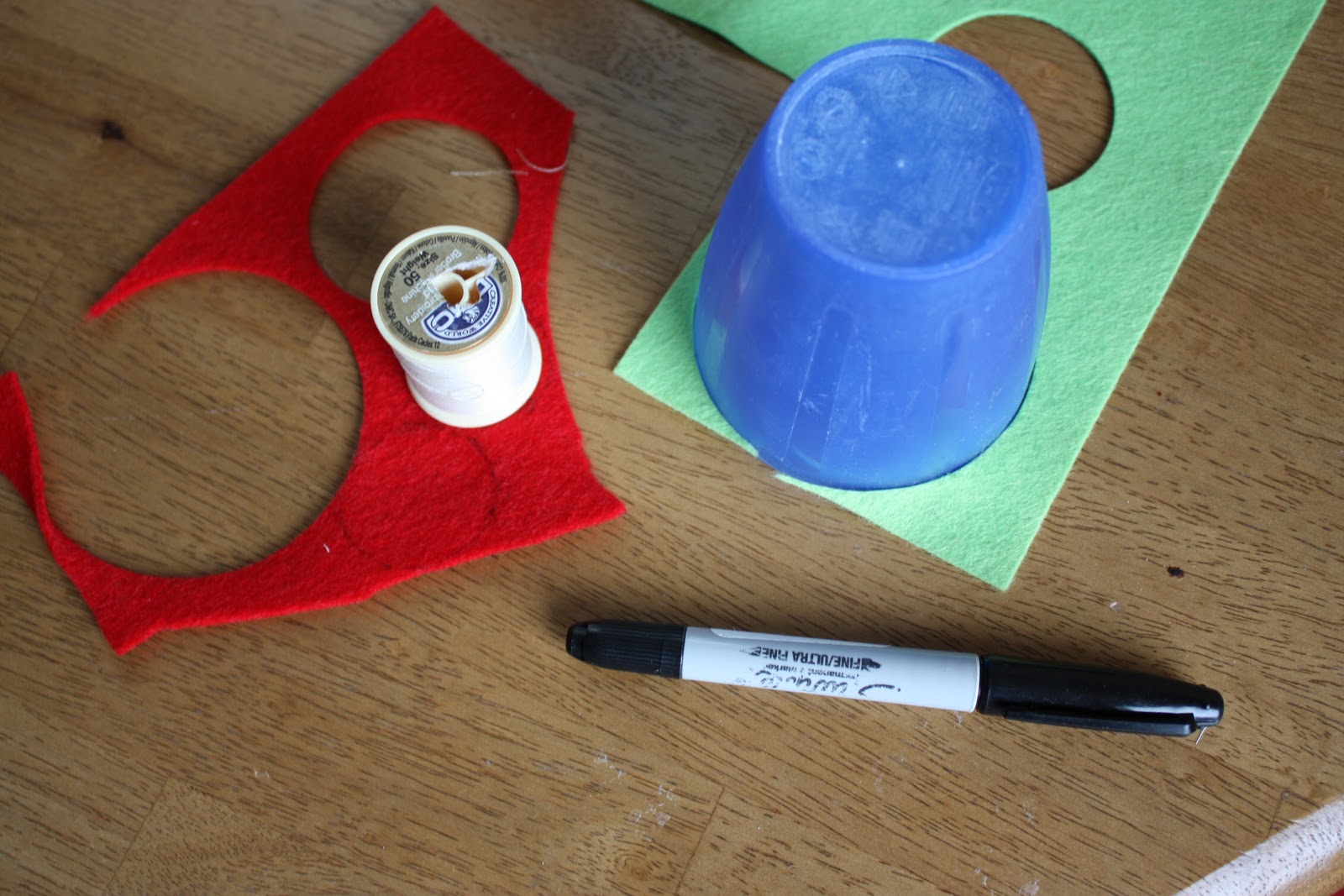 Gather the variety of felt you'd like to use. Scraps are great. I used mostly the el-cheapo felt from any craft/big-box sewing stores, but because I wanted a few more color options I bought a little bit of the nicer wool-felt from a quilt shop. Using a fine-tip Sharpie trace different circle shapes on the felt. Look around your house for a variety of circle sizes. I used my Accuquilt GO! Cutter die cuts for a bunch of mine. Love it!