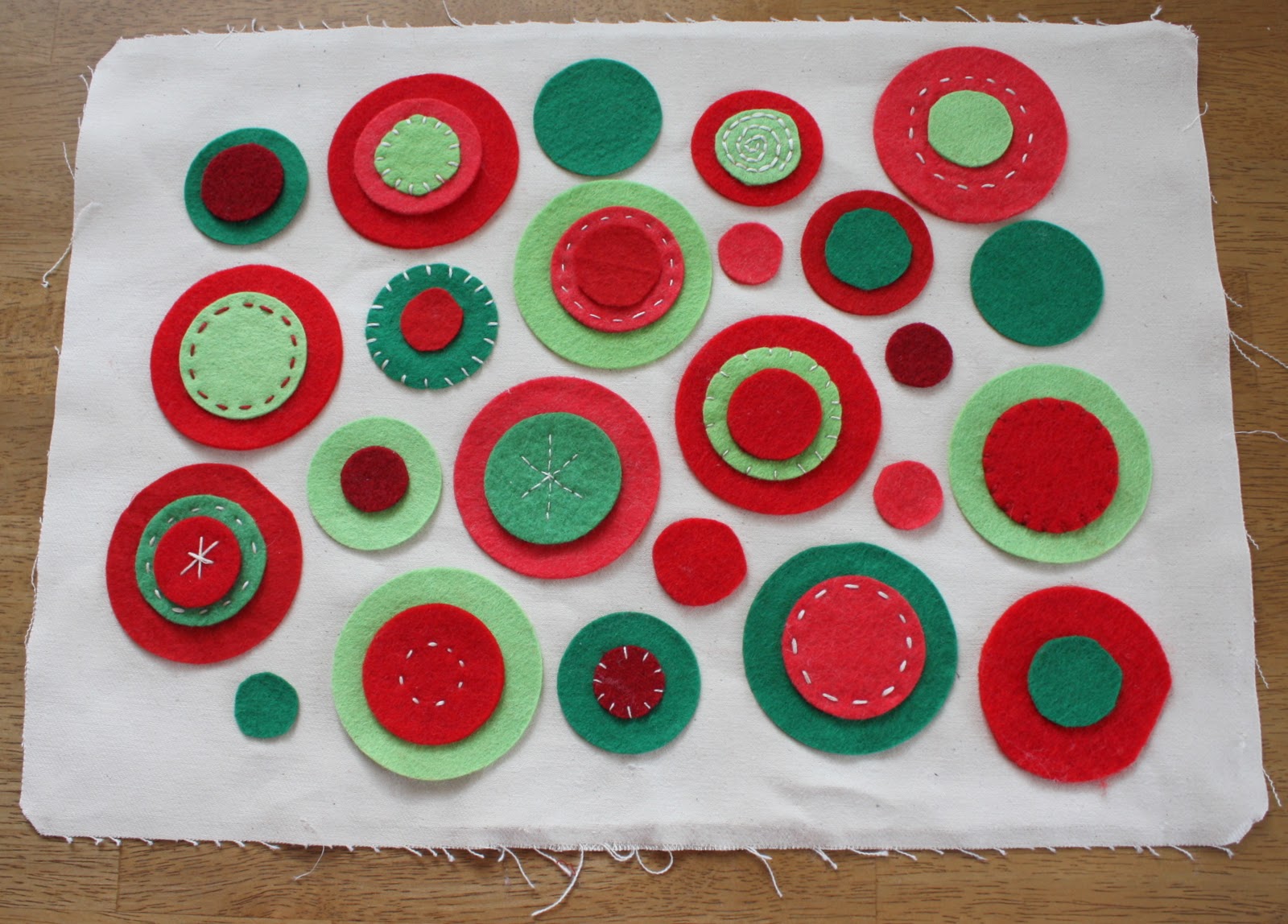 Cut the canvas to the size you want your finished throw pillow to be + at least ¼" on all sides for seam allowance. This project will work best with heavy canvas or duck cloth. (I had some left over from this throw pillow last year.) Lay out the circles on the felt, playing with colors and size until you get a look that you like. (Pretend there isn't any embellishing on these circles yet - I got excited and forgot to take a picture of that part.)