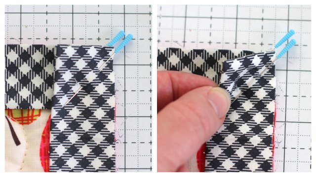 Lift the needle, but do not cut the thread. Rotate the quilt and flip the little triangle flap so that it lies the opposite direction.