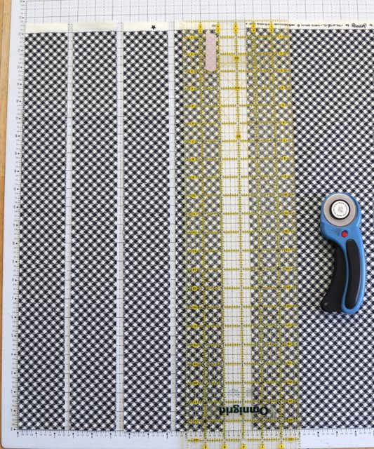 Trim selvage edges off of all strips and sew them end to end with a ¼" seam allowance to create one long strip.