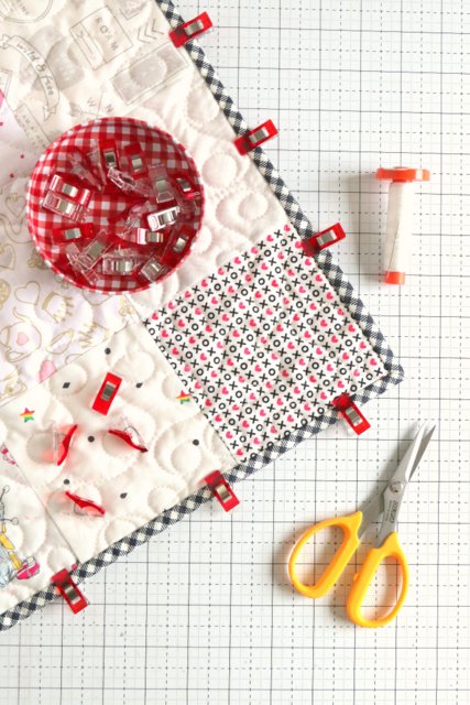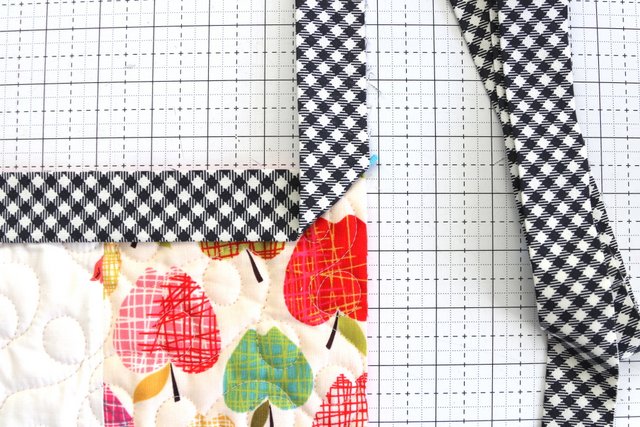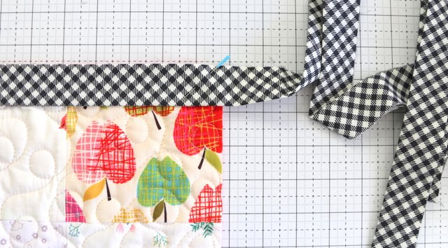 I talk more about how to finish a quilt with a Bias Bindings in this post, including how to cut the bias binding strips, piece the strips together, and sew the binding to a quilt. I also show how to bind a quilt with rounded corners.