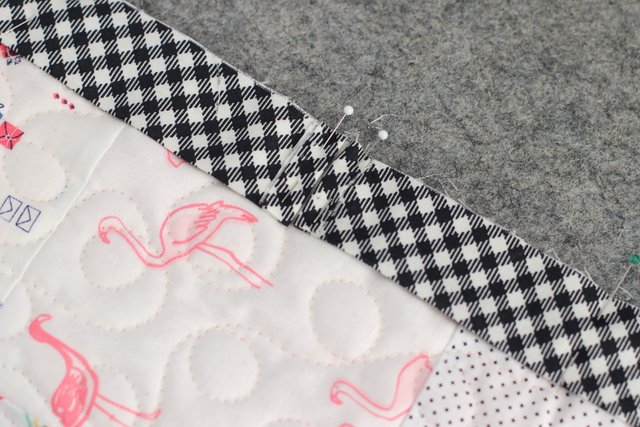 Pin the raw edges (non-folded-edge) to the raw outside edges of your quilt front. This is personal preference, but I like to pin the entire binding to the entire quilt before I sew it down. This helps keep the binding taught and prevents potential wavy quilt edges later.