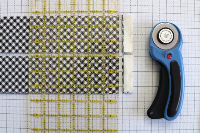Use a ruler and rotary cutter and the quilt top as a guide, trimming the excess batting and quilt back layers for a clean, straight edge. Be careful to keep the quilt's sides square.