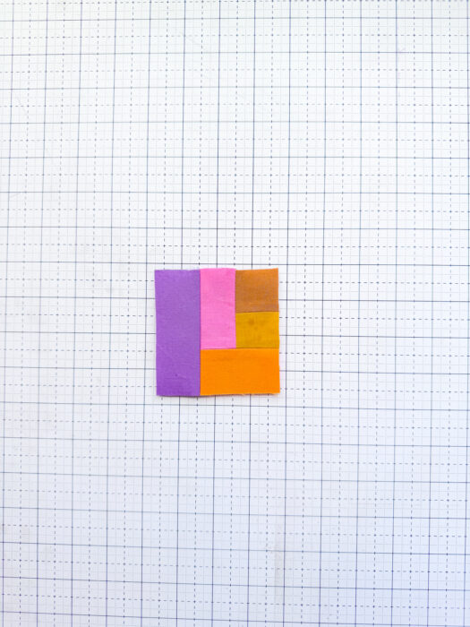 Then, align your D piece with the ABC you just created (keep A at the top!) and with right sides together, sew D to the right side of the ABC unit. Press.