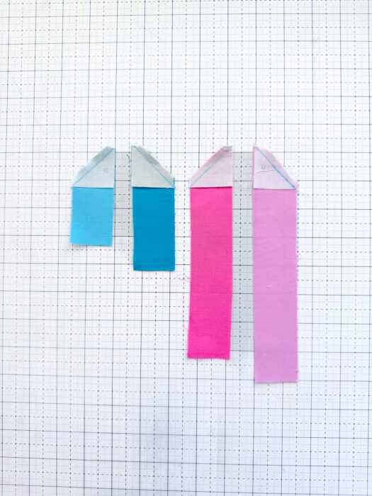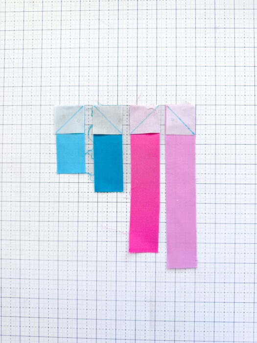 Sew on the drawn lines, then trim ¼" away from your seam lines on each piece. Press.