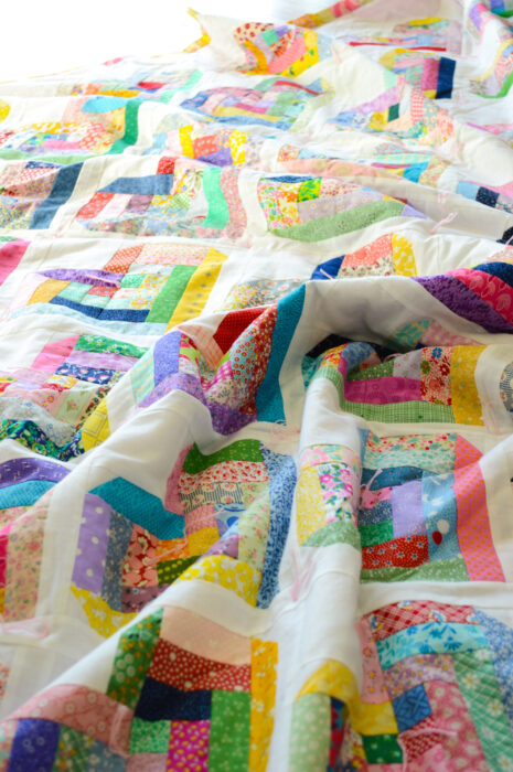 I added 1 ½" sashing strips and setting triangles to make a quilt! I ended up using 78 blocks to make a big cozy quilt! I went with a high loft batting and hand tied it so it's extra snuggly and cozy. In non-Valentine specific colors, it's perfect for year round cuddles!