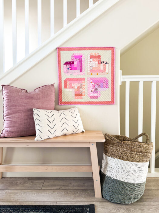 I used 4 Love Lodge blocks to make this mini quilt that I love to pull out for Valentine's Day decor. It could also be a table topper! I didn't set the blocks on point in this project, I just alternated their directions, and then added sashing strips and a border before I quilted and bound it.