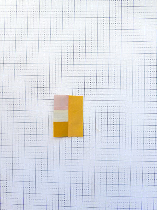 In the same manner as we assembled Unit 1, align J and C right sides together, and sew along the bottom edge. Press.