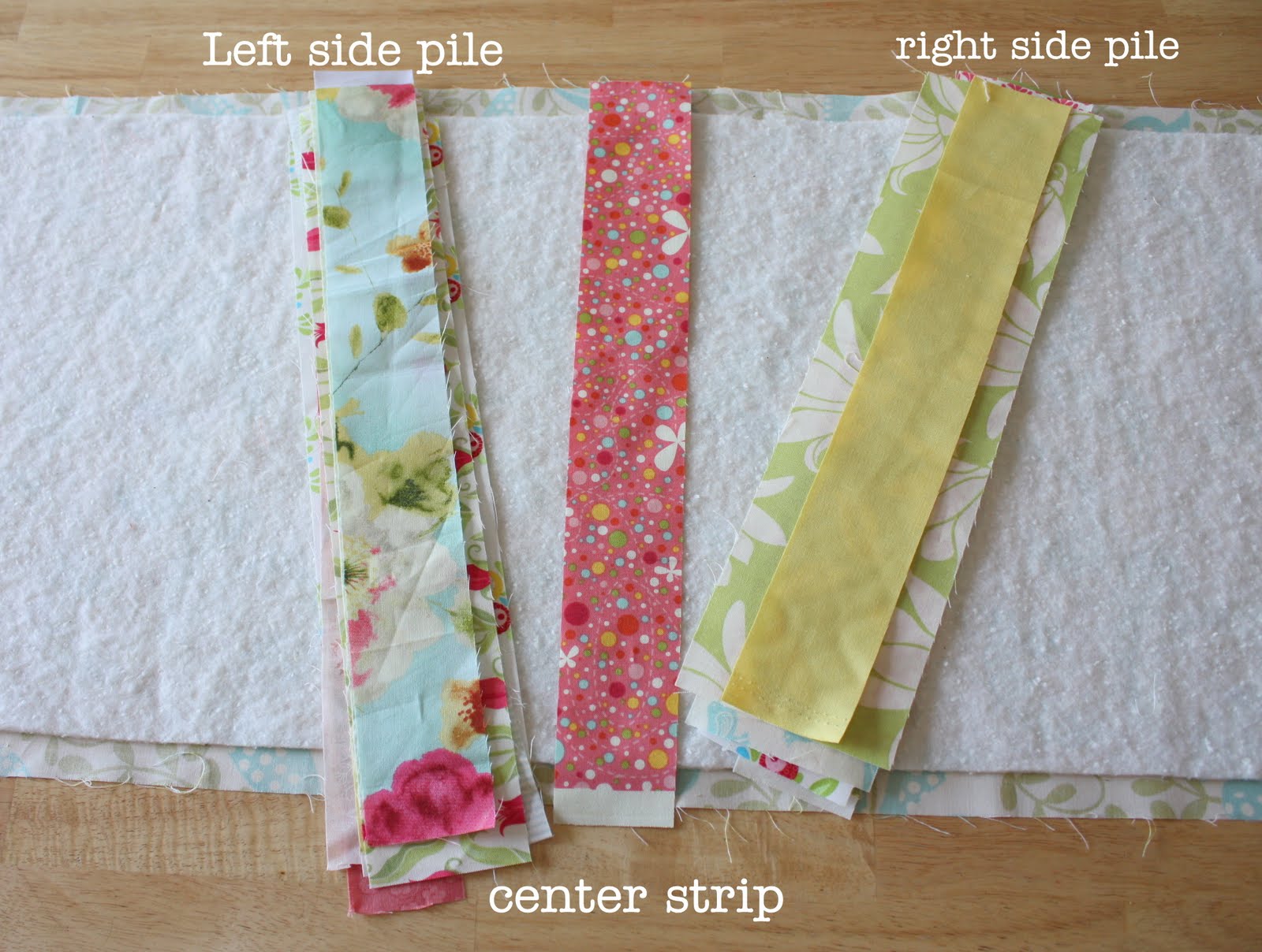 Starting at the center strip (roughly - doesn't have to be absolutely perfect - this isn't rocket science) stack the strips in order they were laid out, making two piles - a right-side-of-center pile and a left-side-of-center pile. Keep the strips and piles in order so you don't have to think (as much) while you sew.