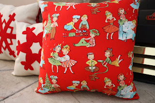 I couldn't resist showing the holly pillow backing fabric, because I love it so much. Cute little retro-kids from Michael Miller.